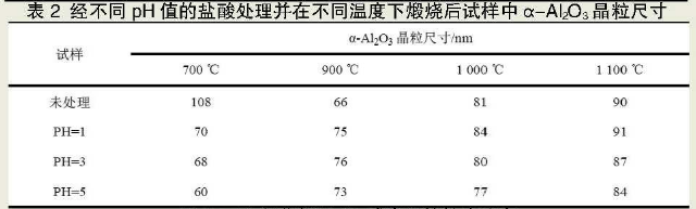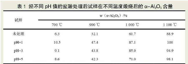 -研究者采用以下4個(gè)步驟制備煅燒氧化鋁粉體:采用球磨機(jī)對(duì)工業(yè)氧化鋁進(jìn)行球磨,球、料質(zhì)量比為4:1,球磨時(shí)間2h;采用去離子水將濃的分析純鹽酸稀釋成pH值分別為1、3和5的鹽酸溶液;用量筒分別量取300mL不同pH值的鹽酸溶液,再分別向其中加入5g球磨后的工業(yè)氧化鋁粉,并在磁力攪拌器攪拌1h,然后將所得的乳濁液進(jìn)行抽濾處理,得到白色沉淀物(即氧化鋁水化物),再將沉淀物重復(fù)上述處理過程3次。將最終得到的白色沉淀(氧化鋁水化物)在110℃干燥12h~24h,然后將這3種經(jīng)酸處理的工業(yè)氧化鋁和未經(jīng)酸處理的工業(yè)氧化鋁分別于700℃、900℃、1000℃和1100℃保溫3h煅燒。