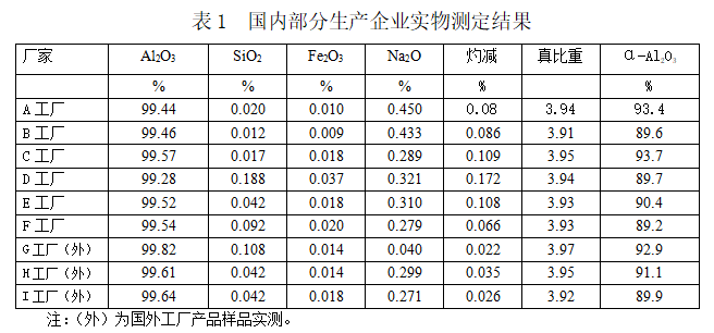 圍繞標(biāo)準(zhǔn)制訂原則,走訪多家用戶企業(yè),召開了用戶座談會(huì),匯總了用戶意見,完成了標(biāo)準(zhǔn)草稿前的建議、意見及數(shù)據(jù)收集工作。同時(shí),為了解其他高溫氧化鋁企業(yè)質(zhì)量情況,收集了其他企業(yè)實(shí)物樣品,并進(jìn)行了檢驗(yàn)分析。(見表1)