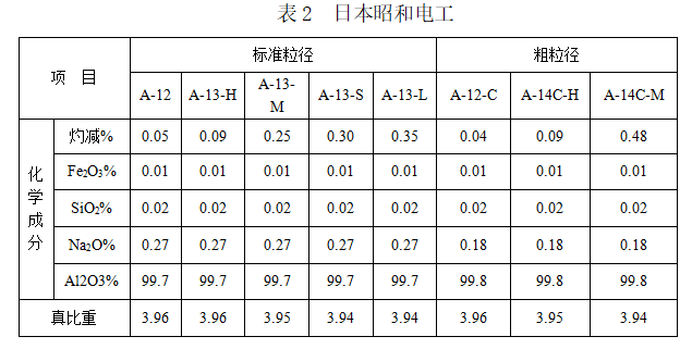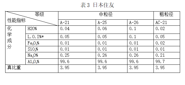 -為提高標(biāo)準(zhǔn)水平,廣泛收集了部分國(guó)外煅燒氧化鋁產(chǎn)品標(biāo)準(zhǔn)。主要有美鋁化學(xué)(現(xiàn)為安邁)、日本昭和電工、住友等國(guó)外煅燒氧化鋁企業(yè)標(biāo)準(zhǔn)(見表2/表3)。根據(jù)調(diào)研、收集的相關(guān)資料,經(jīng)過初步分析、討論,制定了《a氧化鋁》行業(yè)標(biāo)準(zhǔn)征求意見稿,根據(jù)生產(chǎn)廠家和用戶意見制定了預(yù)審稿,通過預(yù)審會(huì)后又根據(jù)會(huì)議專家和用戶意見完成了標(biāo)準(zhǔn)送審稿。