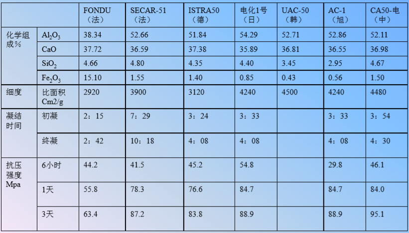 用熔融法生產(chǎn)的高鐵純鋁酸鈣水泥或低鐵純鋁酸鈣水泥,其特點(diǎn)是優(yōu)良的流動(dòng)性和早強(qiáng)性。已 廣泛用于1250℃以下的耐火澆注料,在日本、韓國(guó)、中國(guó),用電弧爐熔融法也生產(chǎn)類似產(chǎn)品, 性能也很優(yōu)秀。圖三為市場(chǎng)上幾種熔融法純鋁酸鈣水泥廠家的性能。