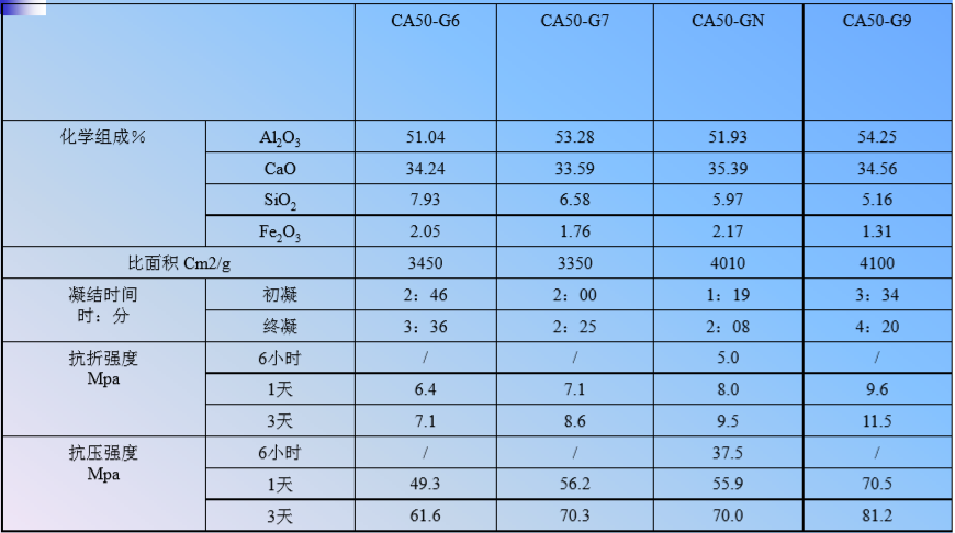 為了加快純鋁酸鈣水泥耐火澆注料的硬化速度,縮短澆注料的養(yǎng)護(hù)時(shí)間,希望純鋁酸鈣水泥具有更早發(fā)揮強(qiáng)度的性能。為了降低澆注料中的純鋁酸鈣水泥組成用量,希望鋁酸鈣水泥具有優(yōu)良的水化活性和高的強(qiáng)度。誕生了早強(qiáng)型純鋁酸鈣水泥CA-50N和高強(qiáng)型純鋁酸鈣水泥CA-50G9。 這兩種水泥需要特別優(yōu)選原料,嚴(yán)格控制工藝過(guò)程和成分范圍。其主要的性能指標(biāo)見下面的圖2。